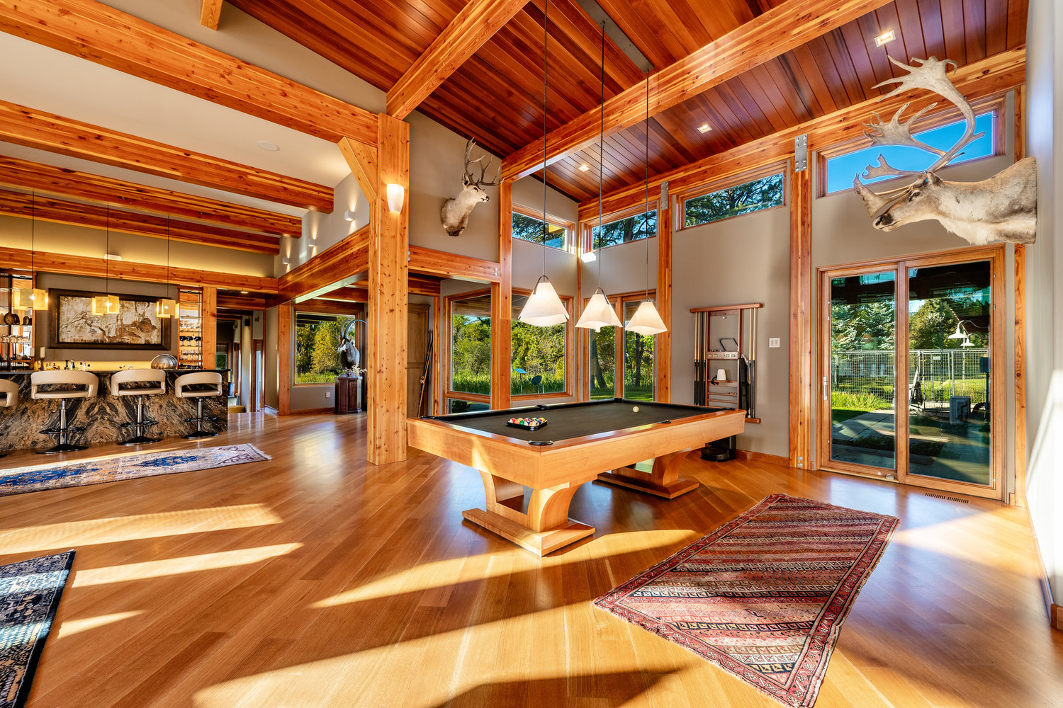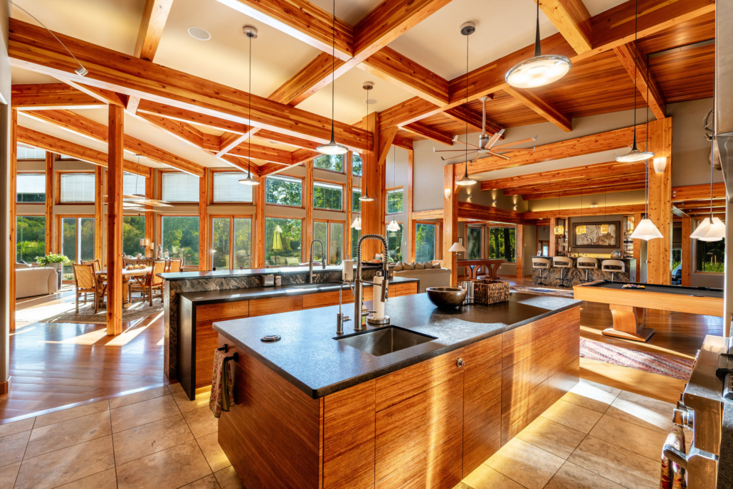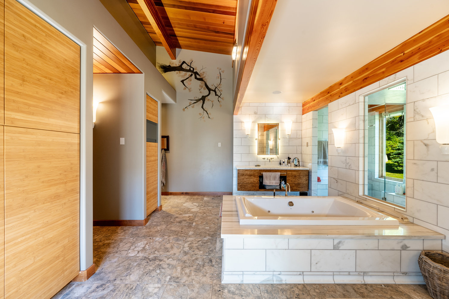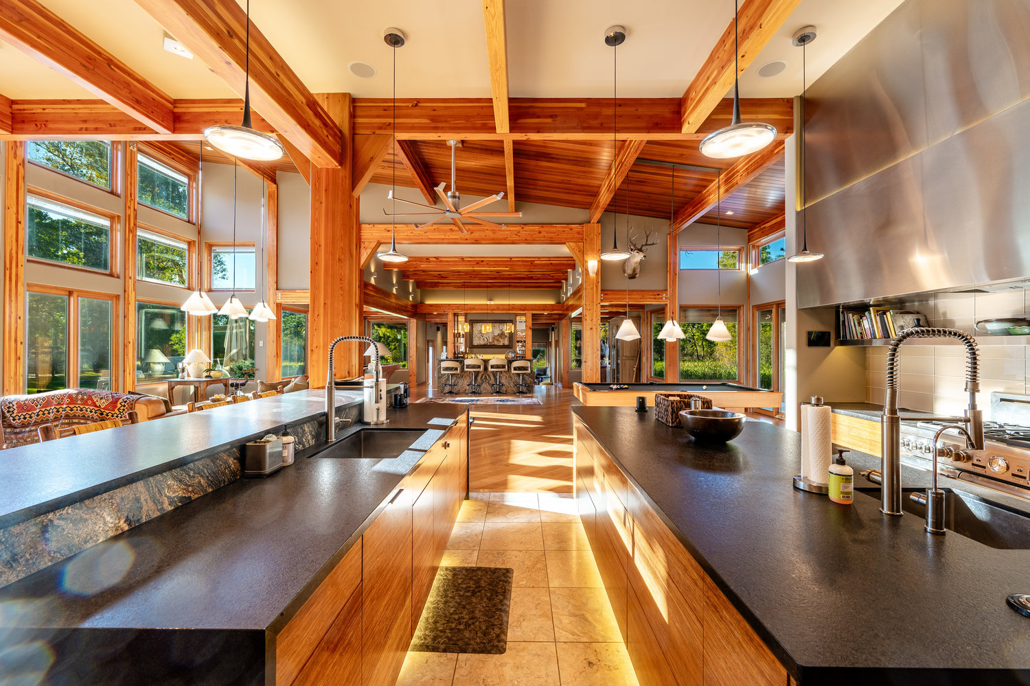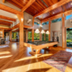 At the heart of the estate is a brilliantly appointed executive home, thoughtfully designed to flow with the natural landscape while showcasing exceptional craftsmanship and attention to detail. The master suite is a private retreat, complete with a sauna, walk-in safe, huge master closet, Jacuzzi tub, his-and-hers bath stations, and a window-framed sitting/exercise room with a private coffee station. A climate-controlled wine cellar ensures your favorite spirits are always ready to enjoy. The private owner wing includes two office spaces for work or study, while expansive windows throughout the home flood the interiors with natural light, highlighting rich wood tones and natural tile.