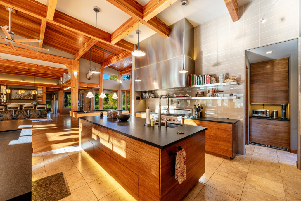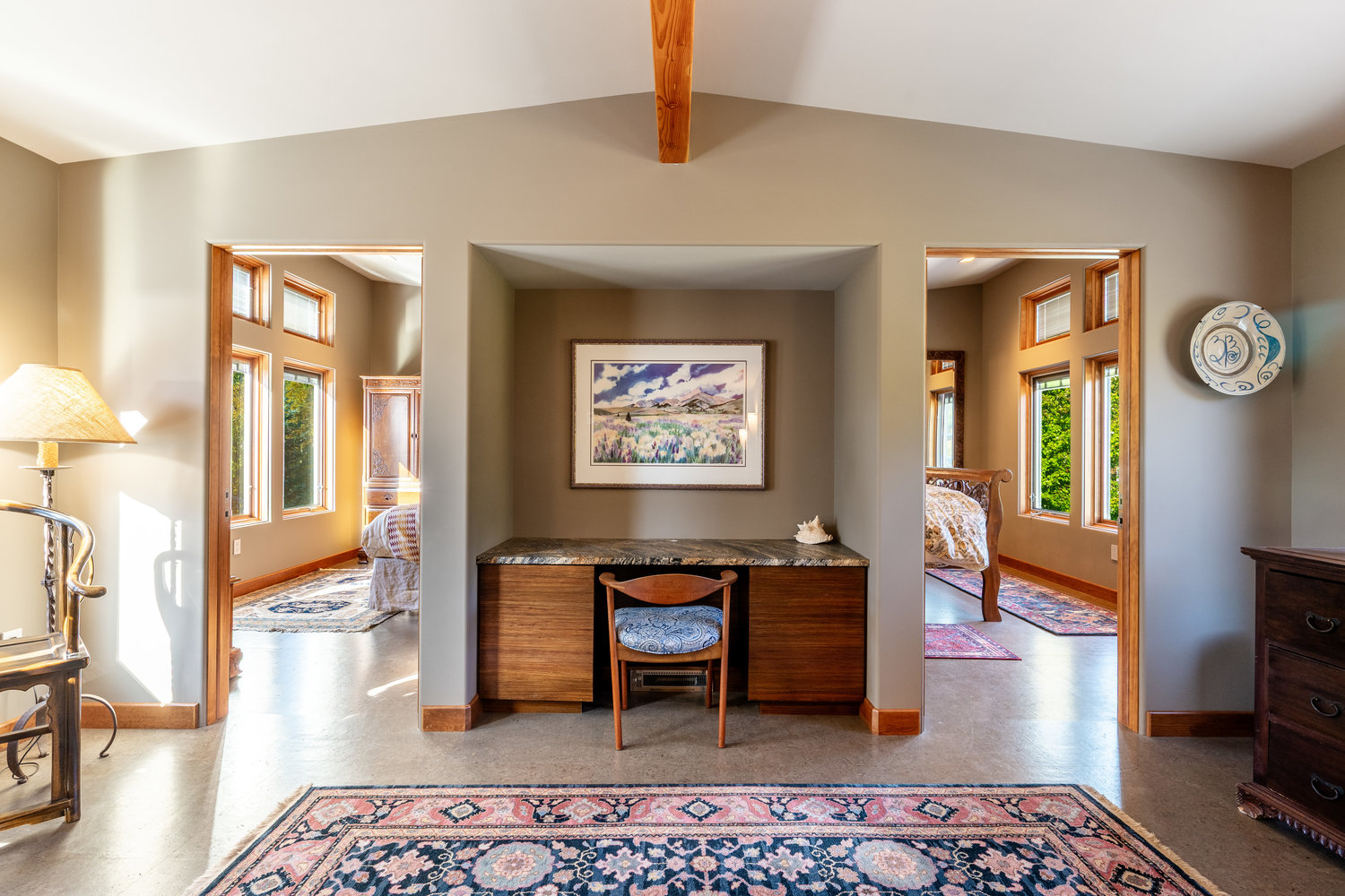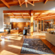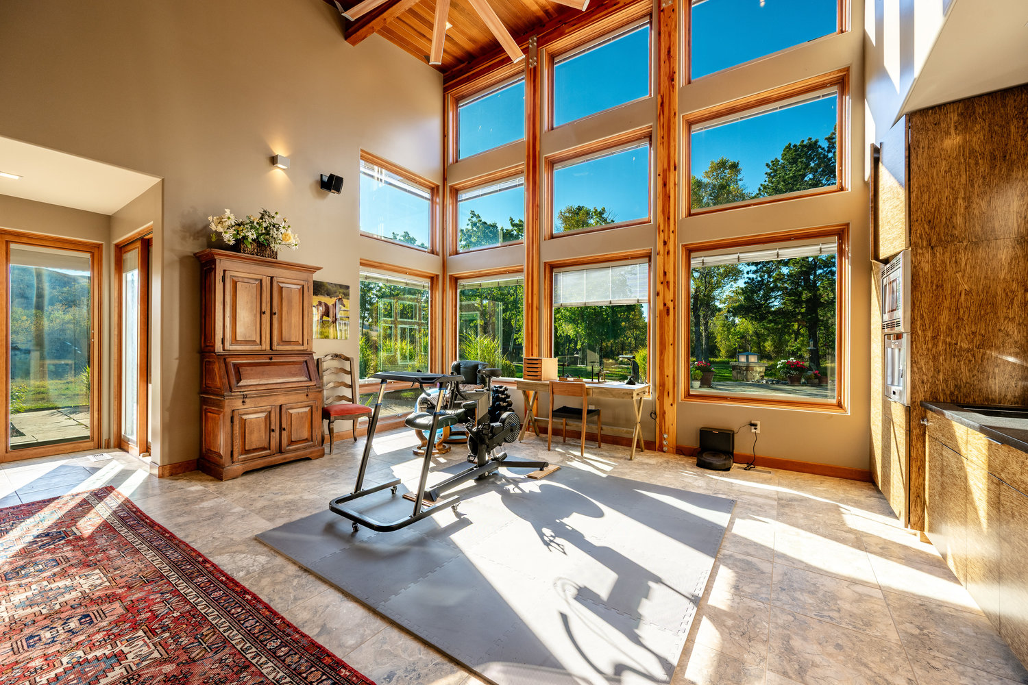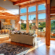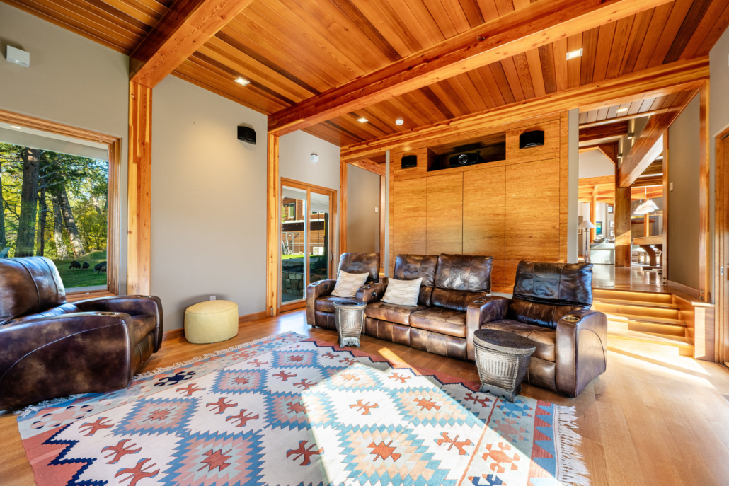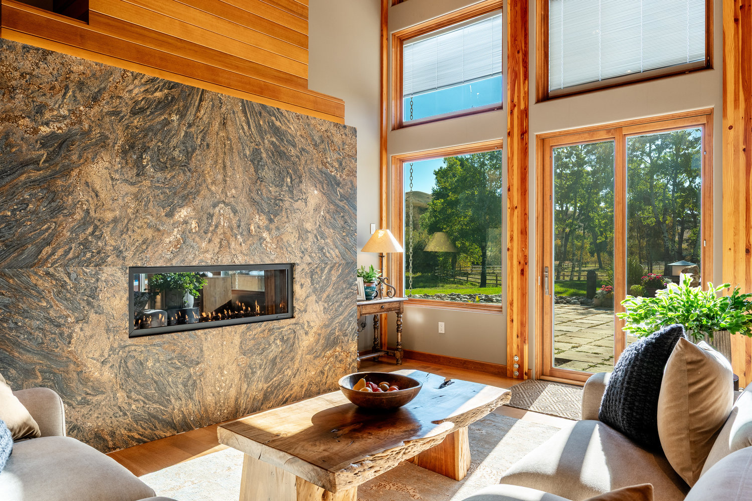 At the heart of the estate is a brilliantly appointed executive home, thoughtfully designed to flow with the natural landscape while showcasing exceptional craftsmanship and attention to detail. The master suite is a private retreat, complete with a sauna, walk-in safe, huge master closet, Jacuzzi tub, his-and-hers bath stations, and a window-framed sitting/exercise room with a private coffee station. A climate-controlled wine cellar ensures your favorite spirits are always ready to enjoy. The private owner wing includes two office spaces for work or study, while expansive windows throughout the home flood the interiors with natural light, highlighting rich wood tones and natural tile.