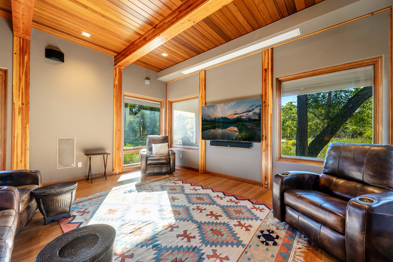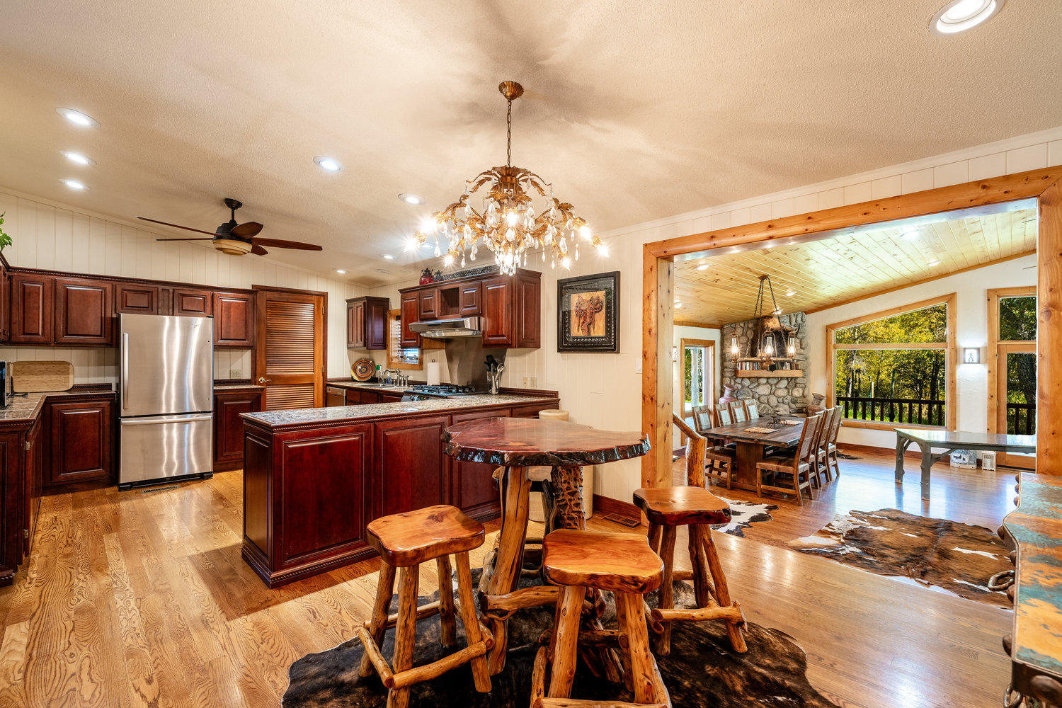 The gourmet kitchen is equipped with multiple refrigerators, a spacious pantry, and flows seamlessly to a craft room and a theater room for entertainment. The guest wing features two classically designed suites, while the outdoor living spaces are equally impressive: hot tub, grilling station, gazebo, fire pit, and even a professionally designed in-ground BBQ pit for the adventurous. For larger gatherings, the western guest house offers three bedrooms and comfortable living, just a trail walk from the main home. A quiet, one-bedroom rustic cabin nestled beside Piney Creek adds additional privacy and charm.